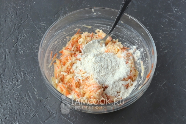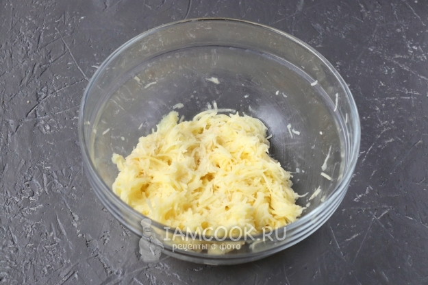 Картофель и лук натрём на средней тёрке. Сразу же их перемешаем, чтобы картофельная стружка не потемнела.