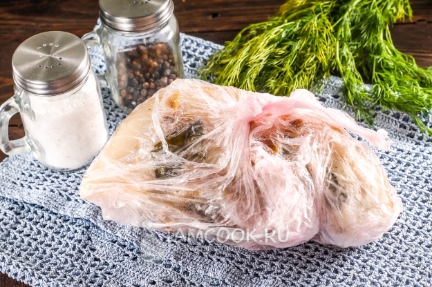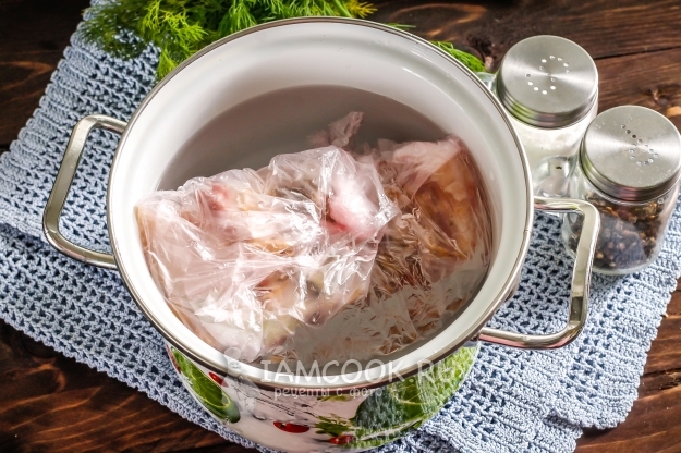 Заверните пакет и завяжите его. Затем поместите полученное в еще один пакет, чтобы он не порвался при варке.