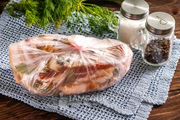 Спустя указанное время выключите нагрев и извлеките вареное сало в пакете. Остудите на холоде.