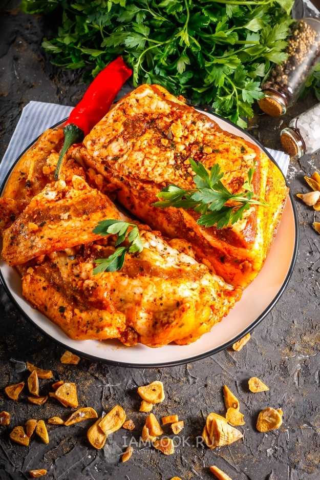 Соленое сало, да вкупе с ароматными и красочными специями - кто из нас сможет отказаться от такого манящего кусочка, особенно с мясной прослойкой?! Его можно подать с любым овощным гарниром, с отварной пастой или с кашей. Мужчины не откажутся от такой холодной закуски под запотевшую рюмочку беленькой! Да и вообще, соленое сало обязано быть в холодильнике или морозилке на случай непредвиденных гостей.