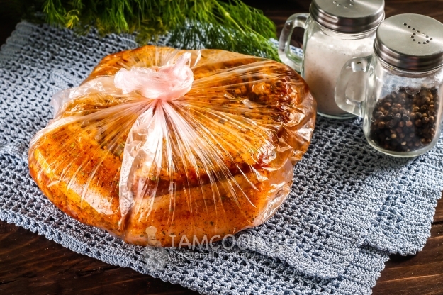 Тщательно промойте куски подчеревка, соскоблите с кожи всю грязь. Один из кусков нарежьте слайсами. Раскройте пакет и поместите его в еще один пакет для прочности. Высыпьте на дно приготовленную ароматную массу и обваляйте в ней сначала крупный кусок сала, затем каждый слайс. Нарезка будет готова примерно за 3 дня, а вот крупный кусок будет солиться около 5 дней.