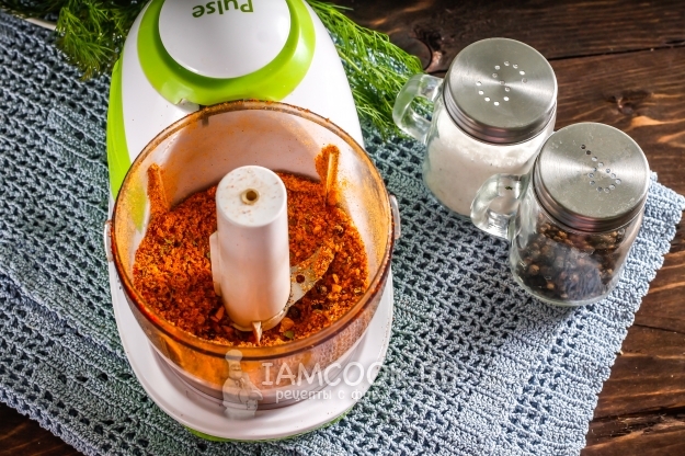 Все специи, лавровые листы и соль пересыпьте в чашу измельчителя и пробейте в ароматную крошку. Не торопитесь открывать крышку - дайте пыли усесться, чтобы не чихать! По желанию можете использовать приобретенную в магазине пакетированную смесь для засолки сала.