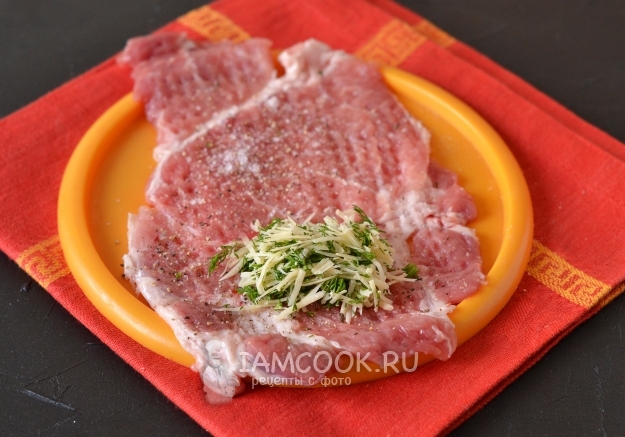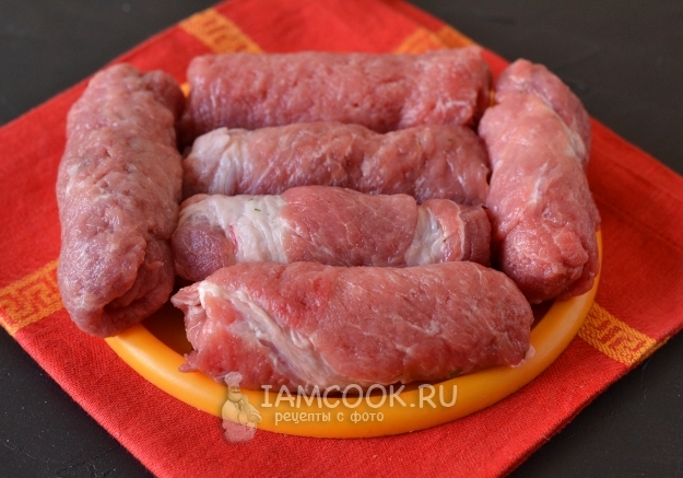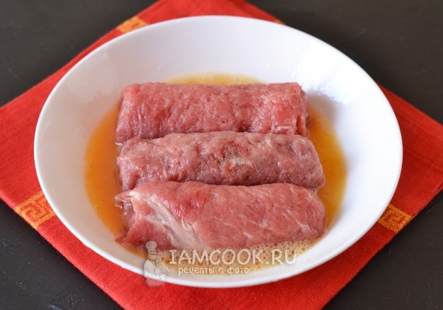Скручиваем свинину в форме рулетика. Чтобы начинка не вытекала, мясные края слегка заправляются внутрь – аналогично формовке голубцов или фаршированных блинов.
