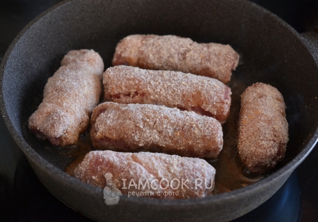 В отдельной емкости взбиваем с солью куриное яйцо. Окунаем заготовки. Прокручиваем, распределяя яичный соус по всей поверхности. В нашем случае яйцо служит неким кулинарным клеем. Нитку для связывания рулетиков я не использую. Мои пальчики идеально держат форму и без нити. Как вам будет угодно.
