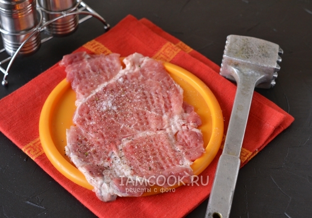 Свинину нарезаем стейками. Я это сделала заранее, предварительно подморозив для ровности кусков. Свиную мякоть необходимо хорошо отбить «молотком» с мелкими насечками. Для удобства пласты мяса покроем пищевой пленкой. Внутреннюю часть отбивной приправляем солью и перцем. Подобным образом действуем со всеми стейками свинины.