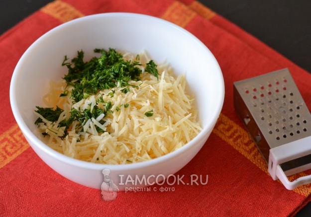 Приготовим начинку для пальчиков. Сыр потрем на терке. Укроп измельчим ножом. Сыр и укроп смешаем между собой. Я это делаю руками. Начинка получается воздушной.