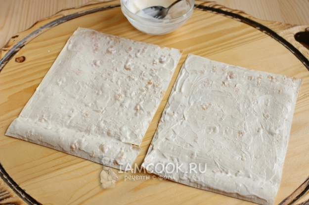 Смазываем кусочки лаваша небольшим количеством смеси майонеза со сметаной, буквально немного, чтобы листы не были сухими.