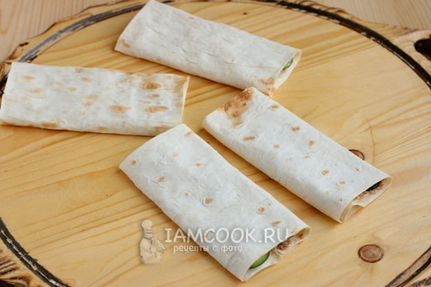 Затем аккуратно заворачиваем лаваш с начинкой на два оборота, чтобы получились вот такие бутерброды. Из каждого большого листа вышло по два бутерброда из лаваша с печенью трески, итого - четыре.
