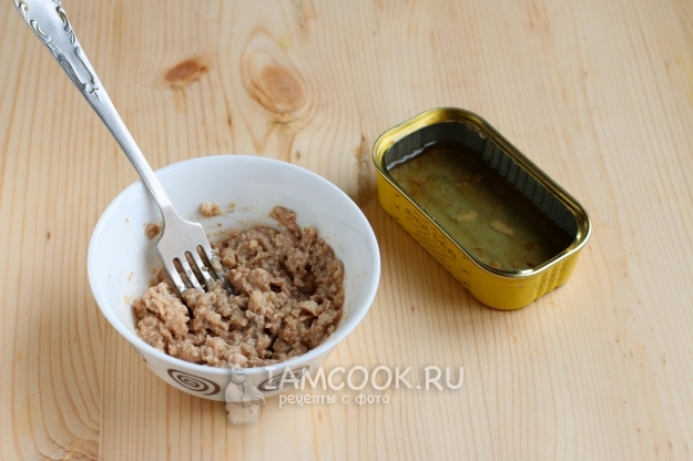Куски печени трески достаем из банки, стараемся сделать так, чтобы масло стекло, так как оно нам не нужно. Перекладываем печень в мисочку и разминаем вилкой.