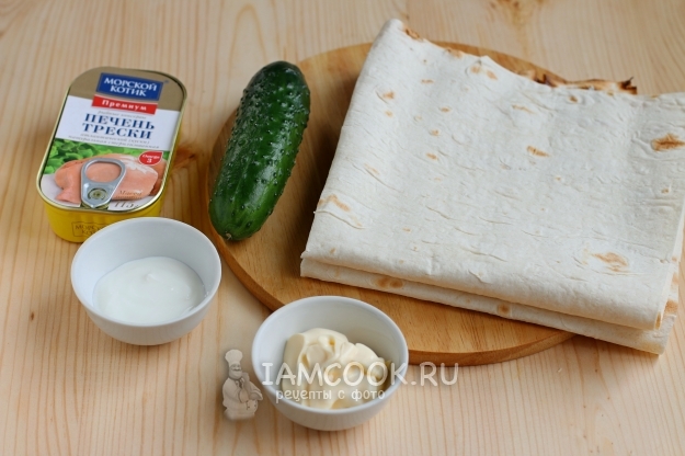 Итак, возьмем нужные продукты для приготовления бутербродов из лаваша с печенью трески и очень быстро приготовим полезный и вкусный завтрак.