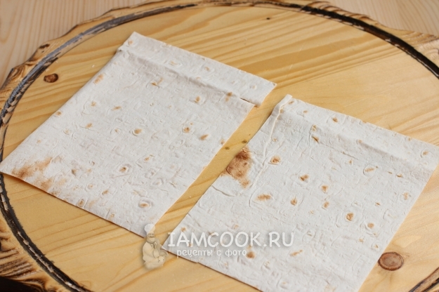 Так как мы готовим бутерброды, а не рулет, нарежем листы лаваша небольшими прямоугольниками размером примерно 13x19 см, чтобы их можно было завернуть всего пару раз.