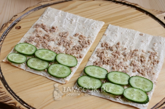 Поверх печени на край лаваша кладем кружочки огурца в два ряда.