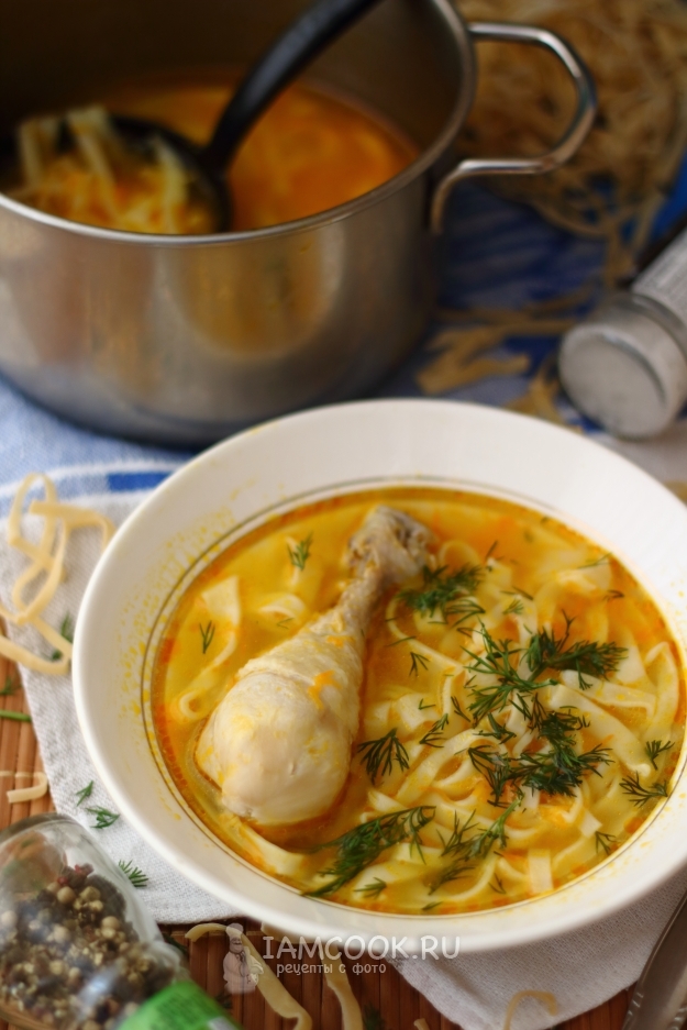 Я нашла это кушанье на одной из советских открыток с рецептами. Оно заинтересовало меня своей простотой. Но первый взгляд оказался обманчивым. Сложность блюда - в самостоятельном приготовлении домашней лапши, в остальном и правда трудностей не возникает.