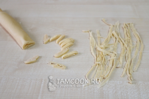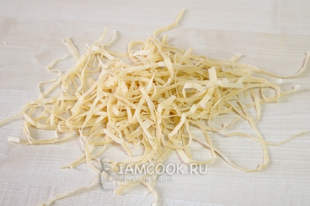 Следом сворачиваем тесто в рулет и тонко нарезаем острым ножом будущую лапшу.