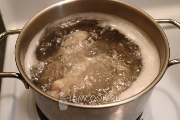 Приступим непосредственно к приготовлению тукмаса. Куриные ножки промываем и выкладываем в закипающую подсоленную воду. Варим наваристый куриный бульон 1-1,5 часа. Не забываем снимать образующуюся на поверхности пенку.