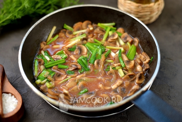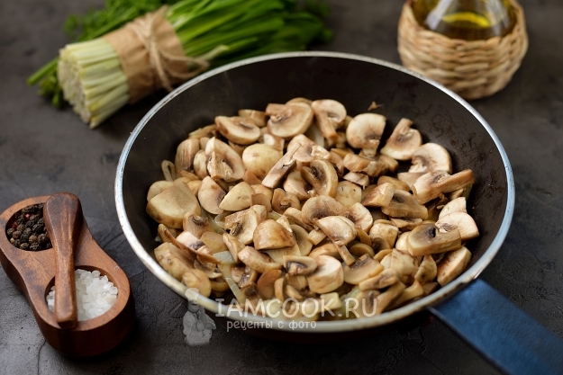 В сковороде разогрейте постное рафинированное масло, обжарьте в нем нарезанный полукольцами репчатый лук. Когда лук будет мягким, добавьте нарезанные пластинками грибы. Готовьте минут 5 все вместе.