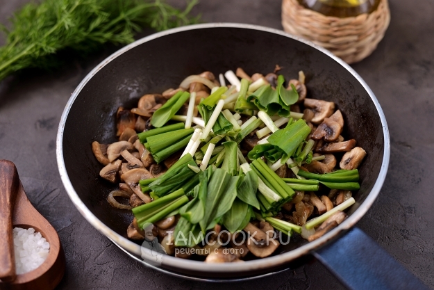 Черемшу нарежьте крупно, положите в сковороду, перемешайте содержимое.