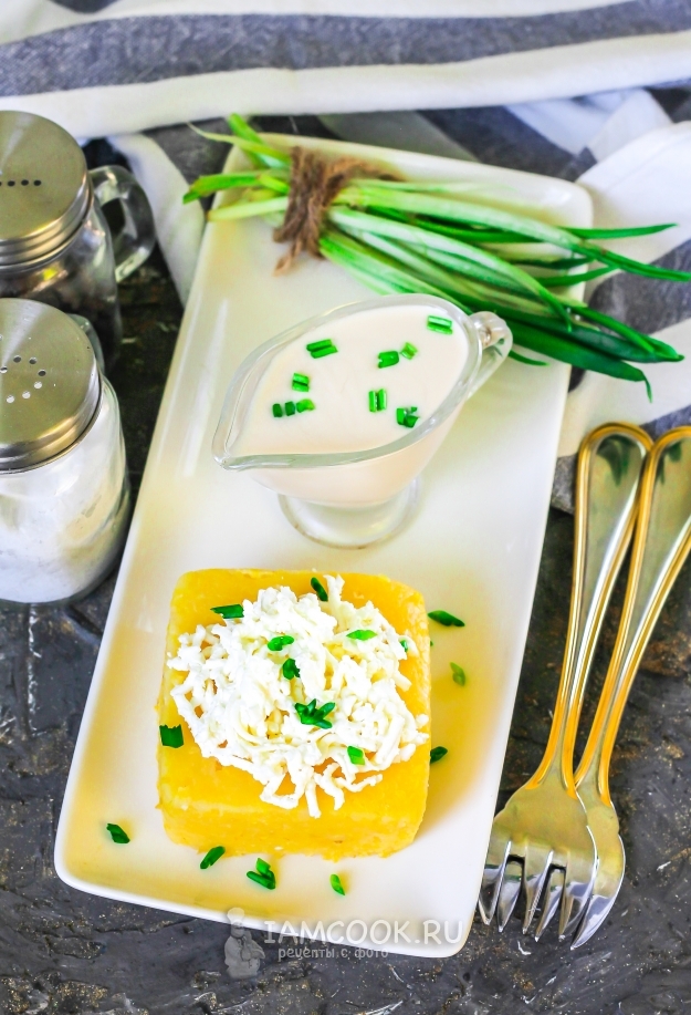 Подайте мамалыгу с брынзой вместе со сметаной или густым классическим йогуртом, свежей зеленью, например черемшой.