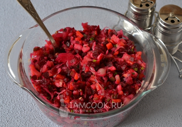 Винегрет – холодный закусочный салат из мелко рубленных отварных овощей. Классический винегрет – это сахарная свекла, картофель, соленые огурцы, квашеная капуста, морковь и лук. Подается в перемешанном виде под салатной заправкой из масла с добавлением соли, перца и 3% уксуса.