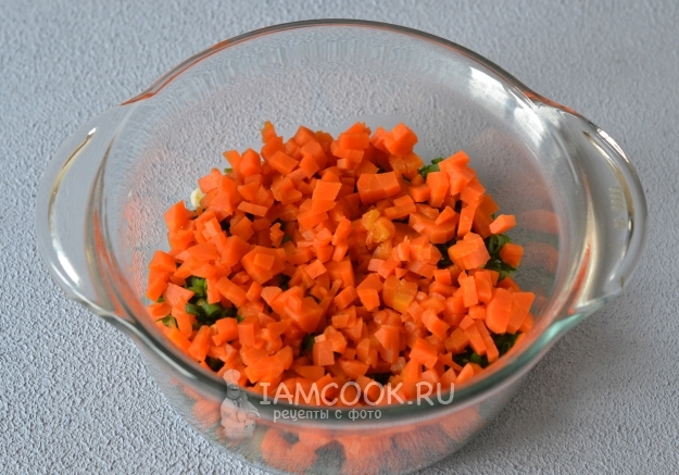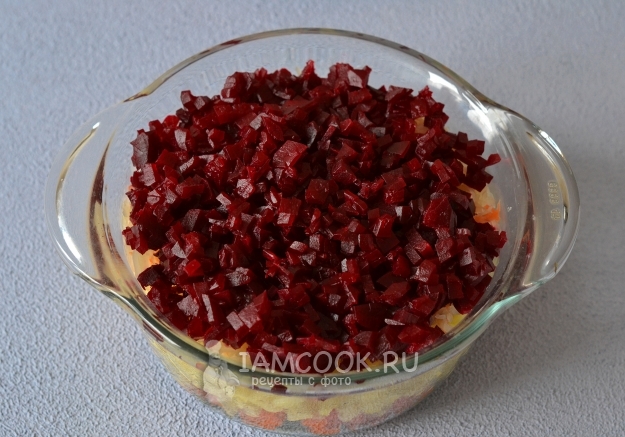 Свеклу нарезаем кубиками. Кладем в салатник.