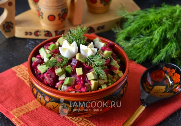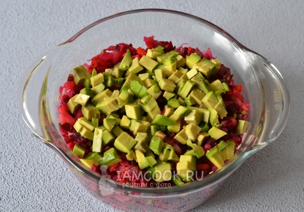 В самом конце в винегрет идут кубики очищенного авокадо. Авокадо - нежный плод, а если он еще и переспел, есть вероятность замятия. Относитесь к нему с нежностью. Перемешивайте салат осторожно.