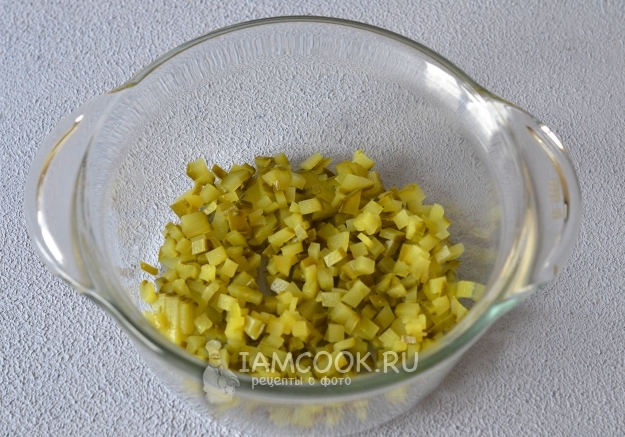 Соленый огурец нарезаем вдоль пластинками. Далее - длинными брусками, а затем - мелкими кубиками. Скидываем в замесочный салатник.