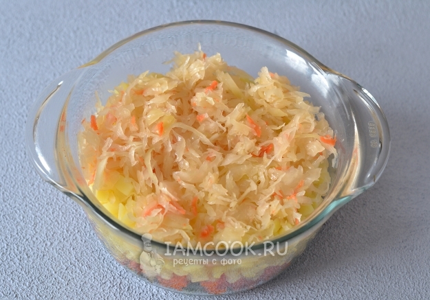 Квашеную капусту нужно отжать от сока. Добавить в винегрет.