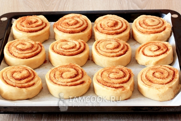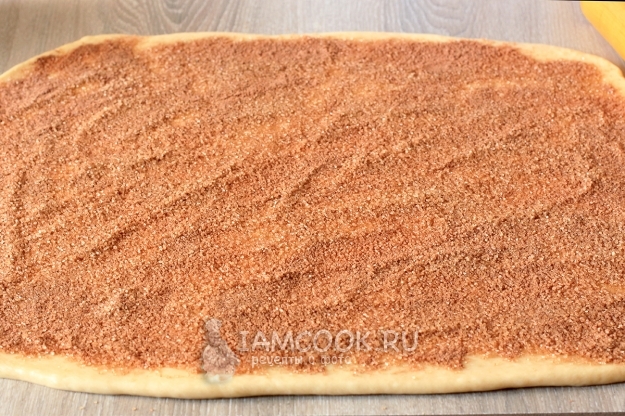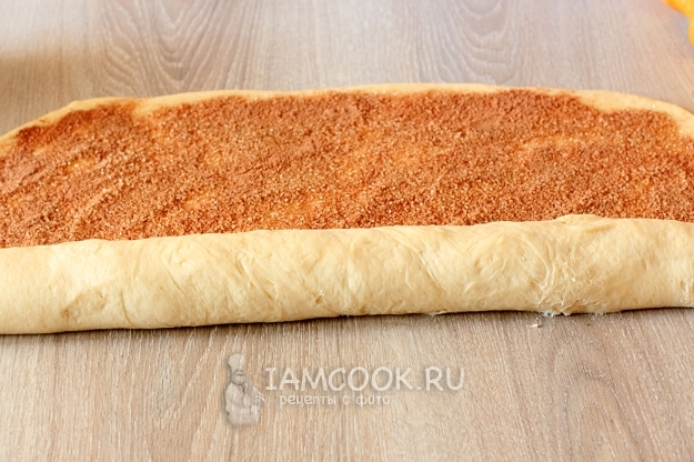 Смажьте тесто мягким маслом и посыпьте сахаром с корицей.
