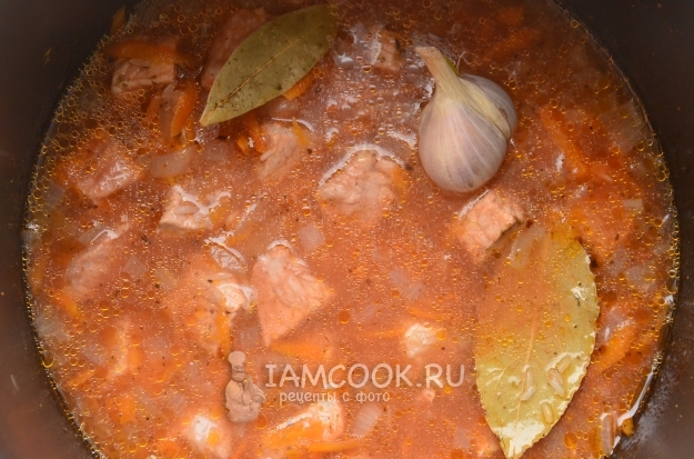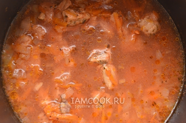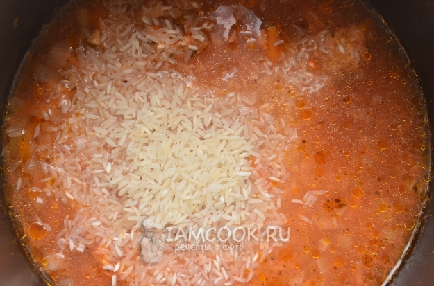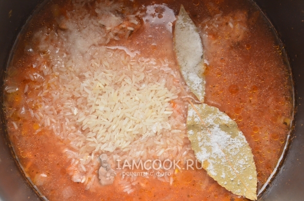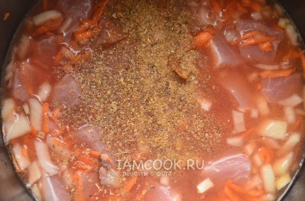 Обжаривайте их несколько минут, после чего влейте в сотейник воду (около 500 мл). Добавьте томатную пасту и специи для плова.