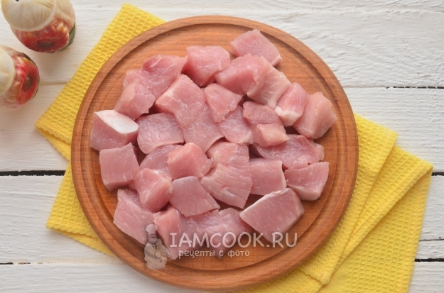Свинину нарежьте на небольшие кусочки, попутно обрезая все лишнее - кусочки жира, косточки (если есть).
