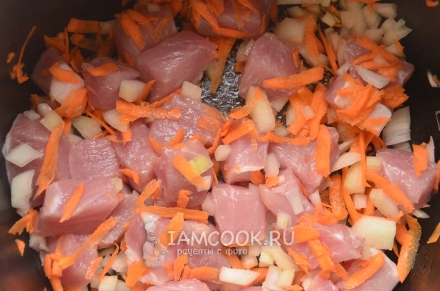 На дне сотейника разогрейте масло для жарки - лучше использовать рафинированное. Оно не имеет яркого вкуса и запаха. Отправьте в сотейник (кастрюльку с толстым дном) кусочки свинины и измельченные овощи.