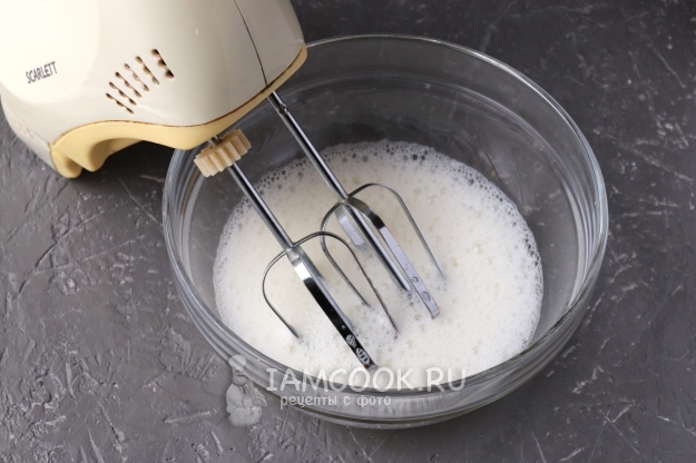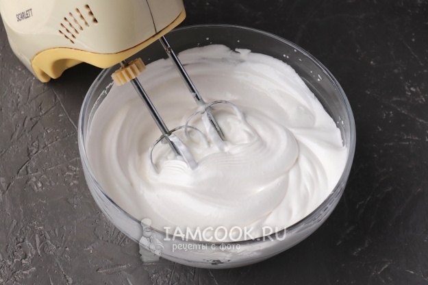 Для приготовления данного блюда нам понадобятся только яичные белки. Поэтому яйца тщательно вымоем под проточной водой, обсушим и аккуратно разделим на желтки и белки. Желтки отправим в холодильник, чтобы в дальнейшем использовать их для приготовления других блюд, а белки взобьем миксером в лёгкую пену. При этом посуда и венчики должны быть идеально чистыми и сухими.
