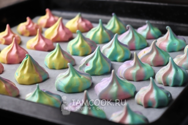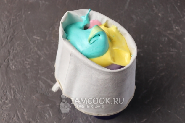 Подготовим кондитерский мешок с насадкой "звёздочка". Переложим белки, чередуя их по цветам.