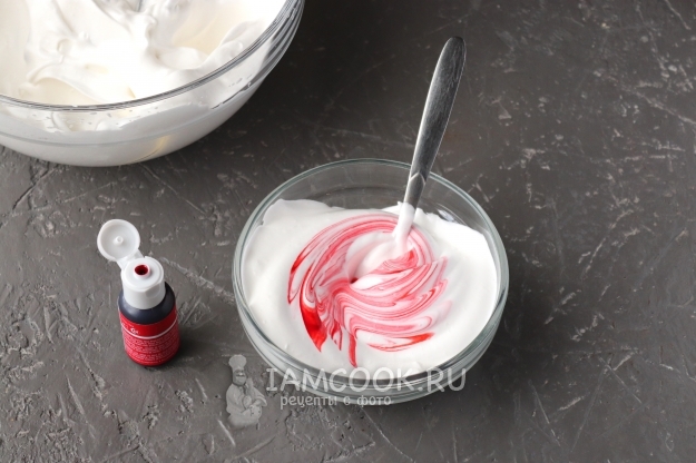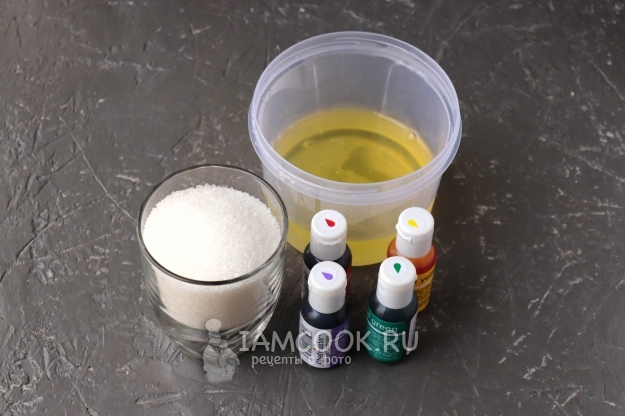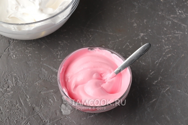 Белковую массу поделим на несколько частей, в зависимости от того, сколько красителей вы планируете использовать. Разложим её по отдельных мисочкам, в каждую из которых добавим пищевой краситель определённого цвета. В моём случае их четыре: красный, зелёный, фиолетовый и желтый.