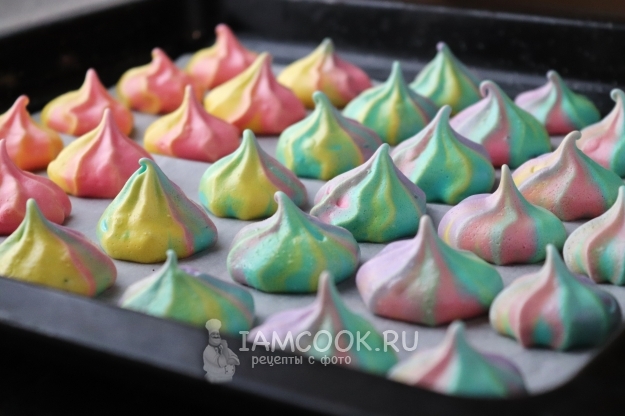 Отправим противень в холодную духовку. Сушить цветное безе придётся долго и при низкой температуре. Примерное время - 1,5-2 часа при 80 градусах, в зависимости от его размера. В течение первого часа дверцу духовки открывать не рекомендуется.