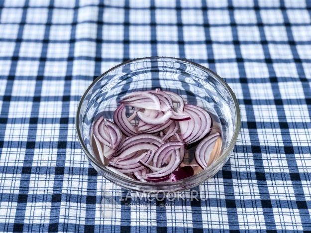 Лук порезать полукольцами, залить холодной водой с уксусом.