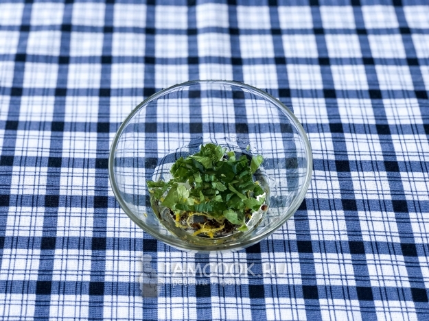 А теперь приступаем к соусу. Зелень измельчить, натереть цедру лимона и выжать сок. Соцветия гвоздики измельчить на мелкие кусочки. Добавить подсолнечное масло и щепотку соли, все перемешать.