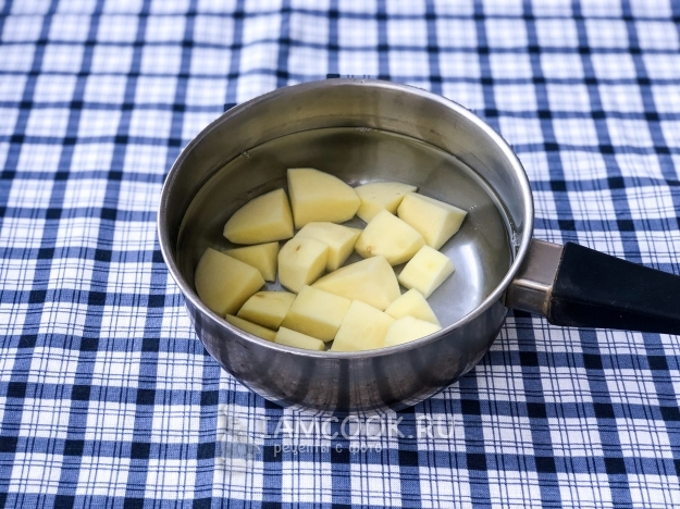 Картофель очистить, порезать на средние кусочки и отварить до готовности. Аккуратнее, не переварите.