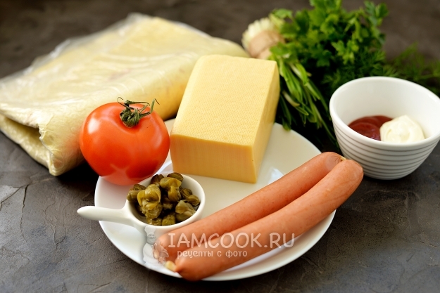 Продукты для приготовления рулета из лаваша с черемшой, сыром и сосисками в духовке подготовьте по списку. Зелень помойте, обсушите. Смешайте до однородности любимый томатный соус и майонез - это будет соус.
