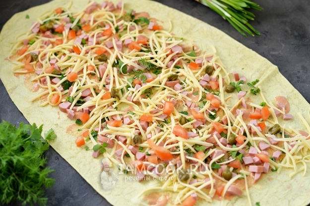 Натрите твердый сыр на крупной терке, нарежьте помидор мелким кубиком. Если помидор водянистый, тогда удалите семечки. Посыпьте ими всю поверхность лаваша, выложите каперсы или маринованный огурчик.