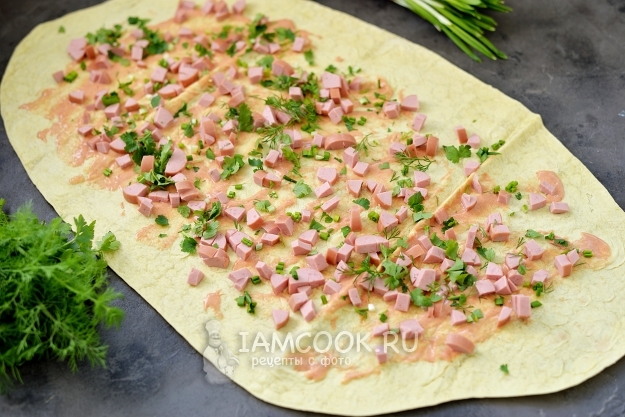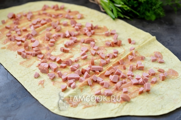 На ровной поверхности разложите лаваш, смажьте его тонким слоем соуса, посыпьте нарезанными мелким кубиком сосисками.