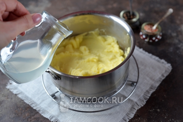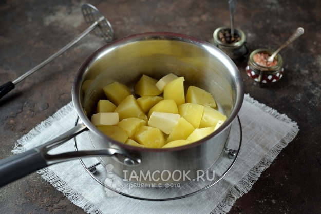 Слейте воду, оставьте какое-то количество этой воды, она нам потом пригодится. Добавьте мягкое сливочное масло, помните картофель мялкой до однородного состояния.