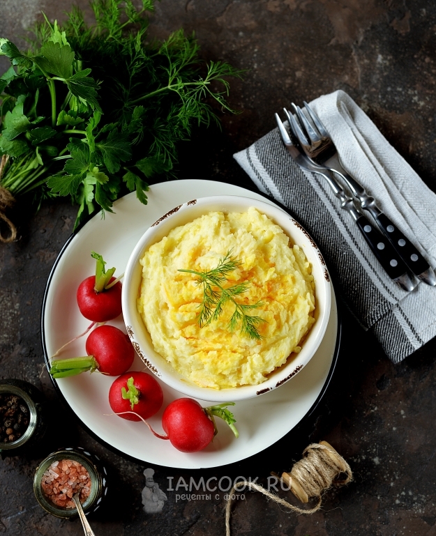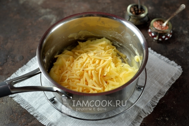 Последним добавьте натертый твердый сыр, быстро перемешайте. Если будете делать все быстро, то сыр в горячей пюрешке расплавится и сделает ее однородной. Кстати, если не угадали с густотой, ее все еще можно отрегулировать с помощью воды, в которой варилась картошка.