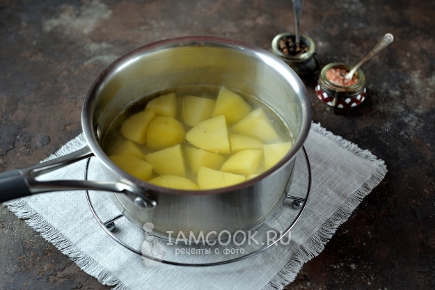 Картофель нарежьте крупными кусками, залейте чистой холодной водой, чуть посолите, отварите до готовности.
