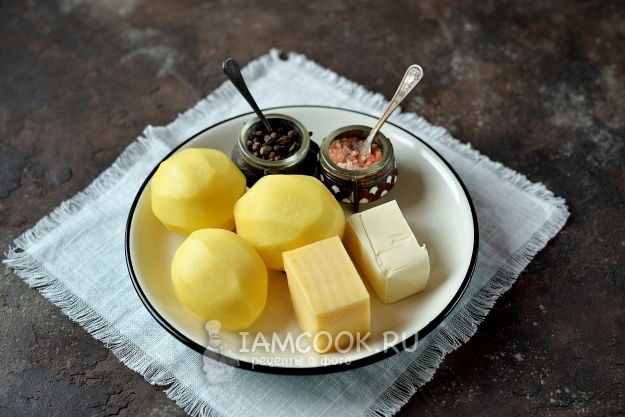 Подготовьте продукты по списку. Картофель почистите от кожуры, помойте. Масло должно быть комнатной температуры, сыр лучше всего взять того сорта, который хорошо плавится при высокой температуре.