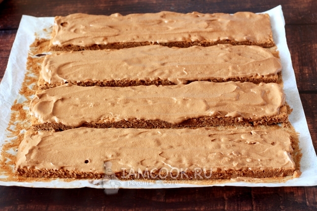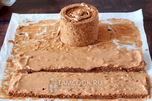 Готовые бисквиты снимите с противня прямо с пергаментом. Аккуратно отделите их от пергамента и разрежьте на одинаковые ровные полоски. Края обрежьте, они пойдут на крошку для украшения. На этом этапе можно пропитать бисквит кофе или сиропом, или шоколадным ликером. Я не пропитывала ничем.