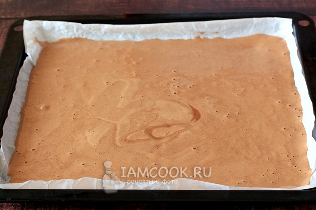 Мысленно разделите тесто на два противня. Вылейте одну часть на пергамент и поставьте выпекать в разогретую до 180 градусов духовку. Если не уверены в своем пергаменте, то смажьте его маслом, я же не смазываю никогда. Ориентировочное время выпечки - 10 минут. Следите за своей духовкой. Если при нажатии бисквит пружинит, значит, он уже пропекся. Зажаривать его не нужно, чтобы не пересох. Испеките по очереди два одинаковых бисквита.