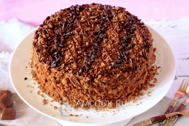 Вот такой торт получается. Подравняйте края кремом, обсыпьте крошкой и украсьте по своему вкусу.