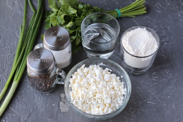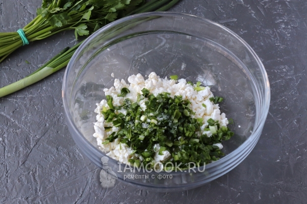 Тем временем готовим начинку. Зелень промываем под проточной водой и тщательно встряхиваем или просушиваем бумажными полотенцами. После чего лук с петрушкой мелко нарезаем и соединяем с творогом. Солим и перчим по вкусу.