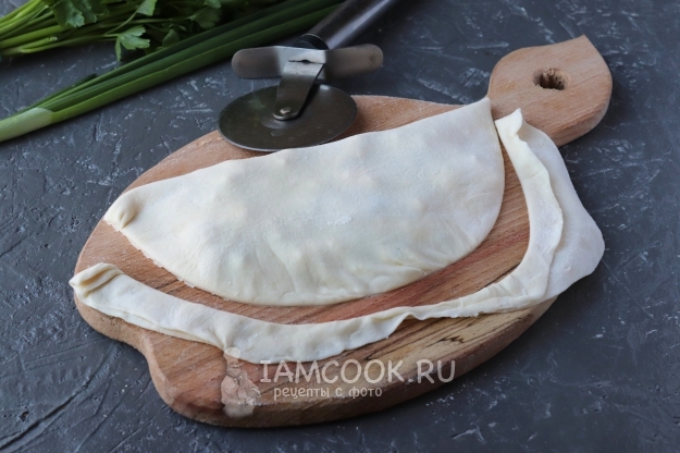 Накроем свободной частью, а лишнее тесто обрежем роликовым ножом. Кончиками пальцев пройдёмся по краям, соединяя их между собою.